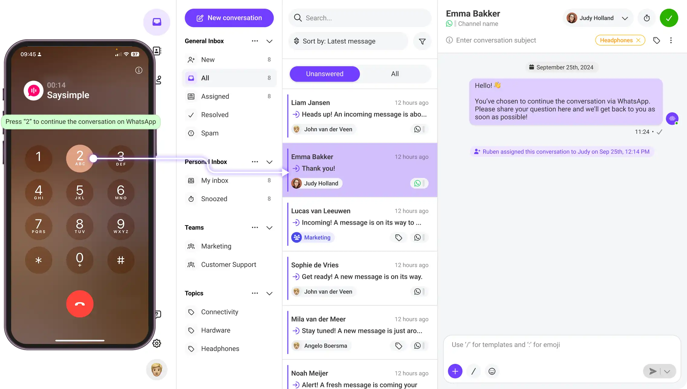 Saysimple allows you to manage all your channels in one place, collaborate more effectively and ultimately save time. Acces your inbox with multiple users, launch WhatsApp Marketing campaigns, integrate your existing systems and reap the benefits of data-driven automation.