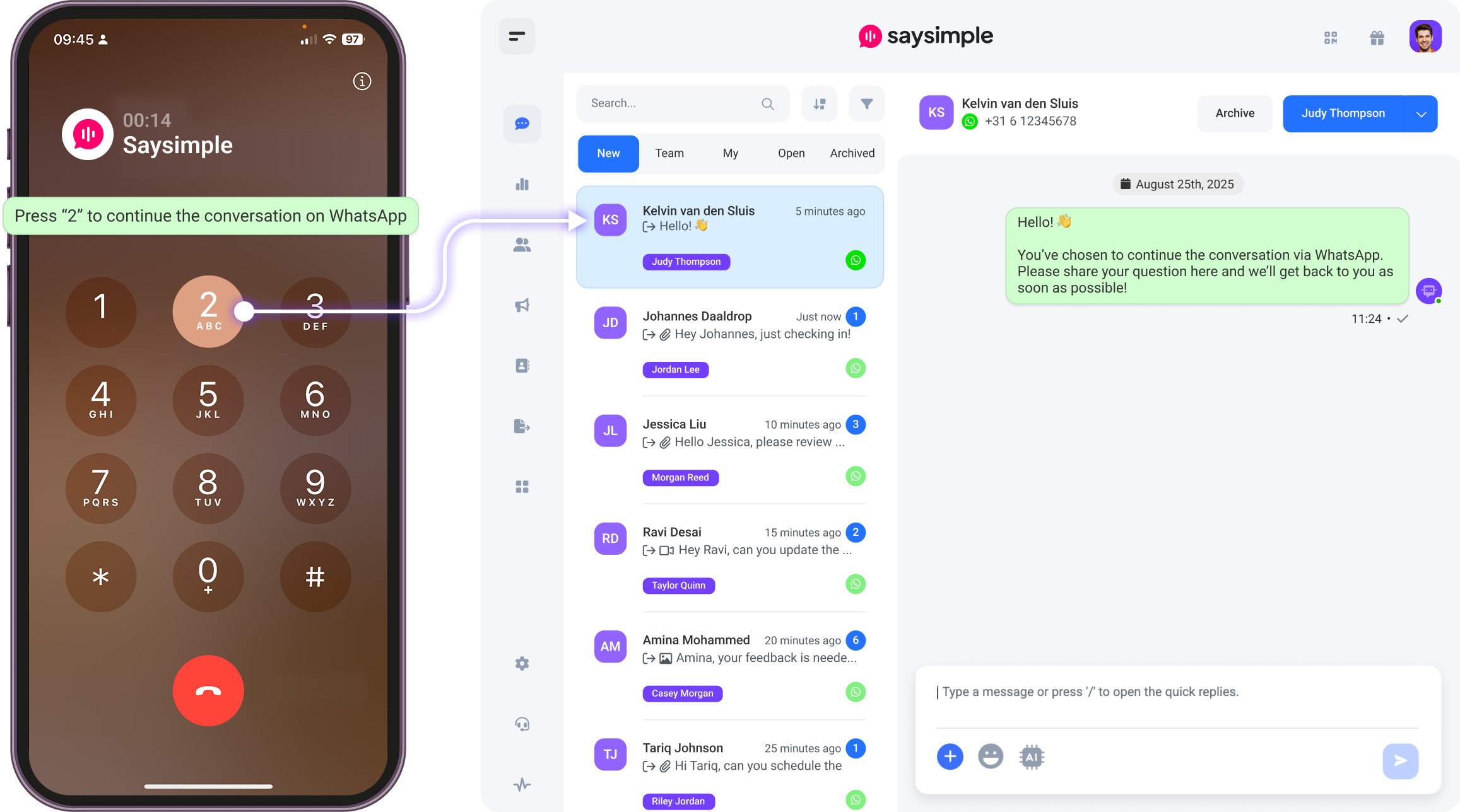Puedes darle la opción a los clientes que te llamen, redirigir la llamada normal a una conversación escrita por WhatsApp, donde los agentes podrán gestionar su consulta a través de Saysimple.