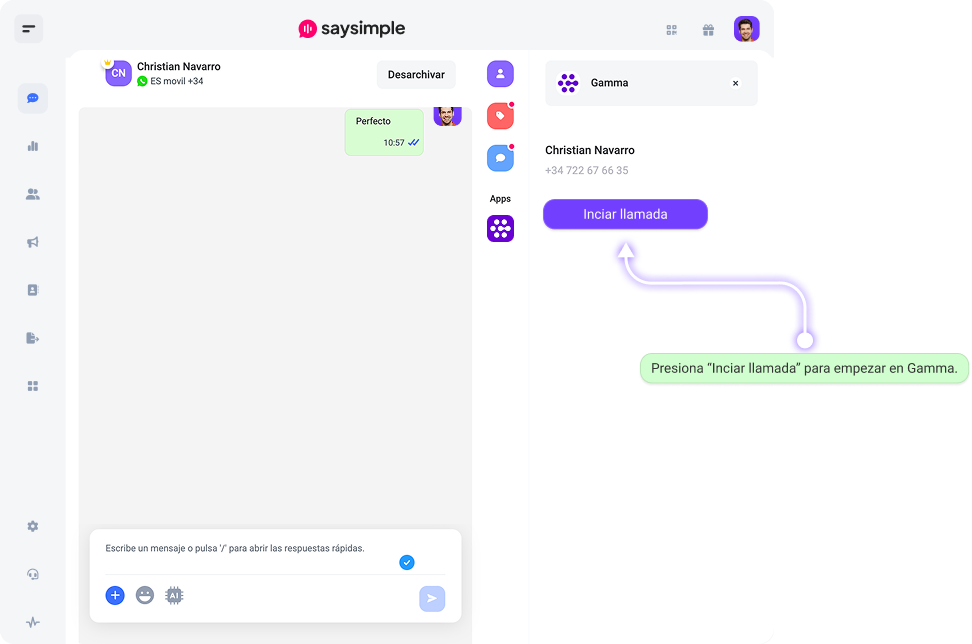 Puedes iniciar una llamada telefónica en Gamma directamente desde la bandeja de entrada de Saysimple. Así gestionas tus conversaciones por WhatsApp, chat o redes sociales y, cuando lo necesites, pasas a una llamada