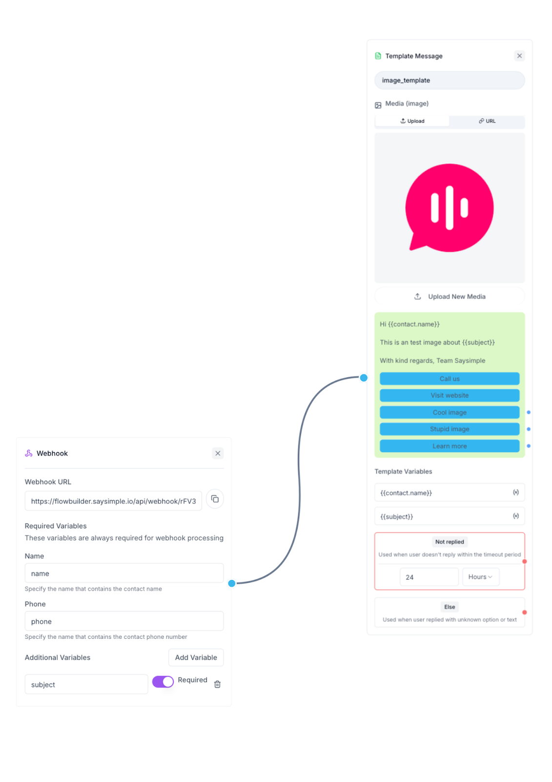 - Actie = een POST-verzoek naar de Webhook van de Saysimple Flow Builder.
